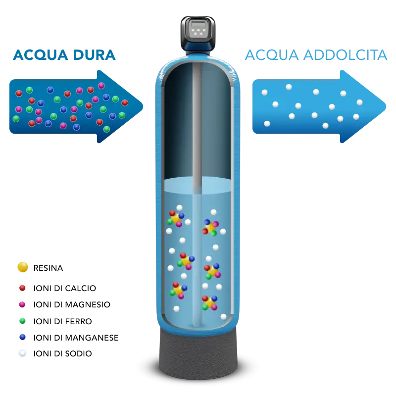 Esistono diversi metodi per eliminare o ridurre la durezza nell’acqua , ma l’addolcimento con RESINE A SCAMBIO IONICO é sicuramente il più semplice, affidabile e versatile.